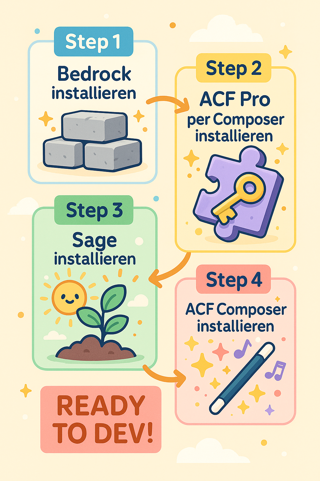 StartStart Willkommen in der internen Doku. Nutze die folgenden Kapitel: 🚀 Projekt-Setup (Standard) 📘 Anleitung: WordPress Entwicklungsumgebung mit Bedrock + Sage/Acorn + ACF Pro + ACF Composer 🔑 How to ACF Pro mit Composer